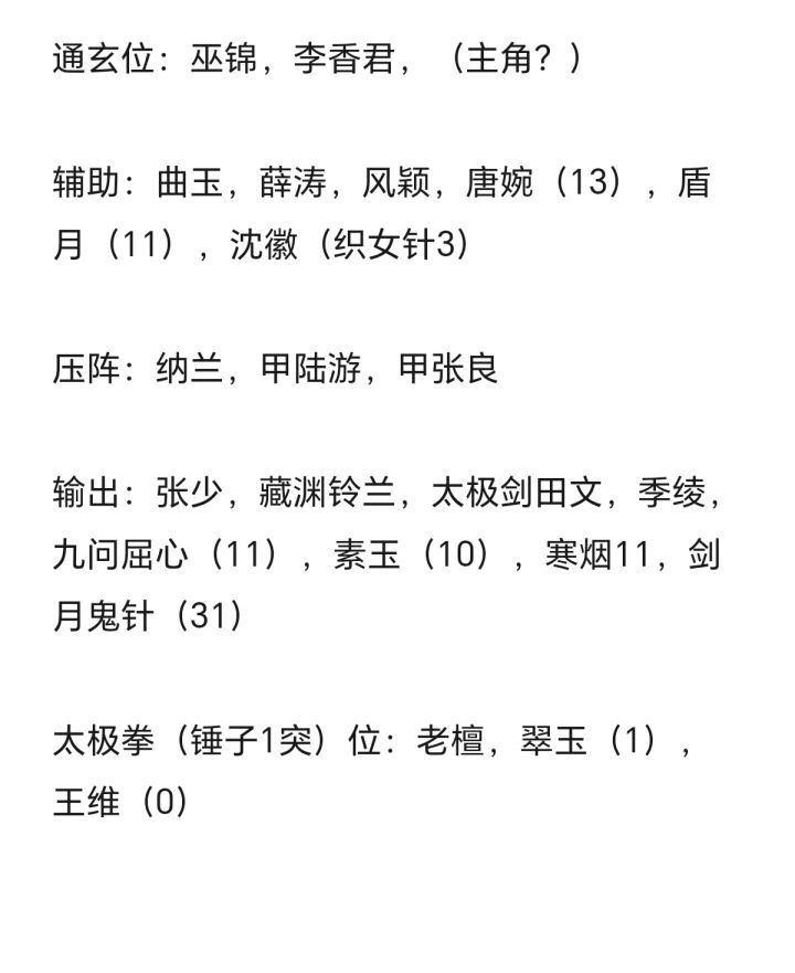 输出:张少,藏渊铃兰,太极剑田文,季绫,九问屈心(11),素玉(10),寒烟11,剑月鬼针(31)
