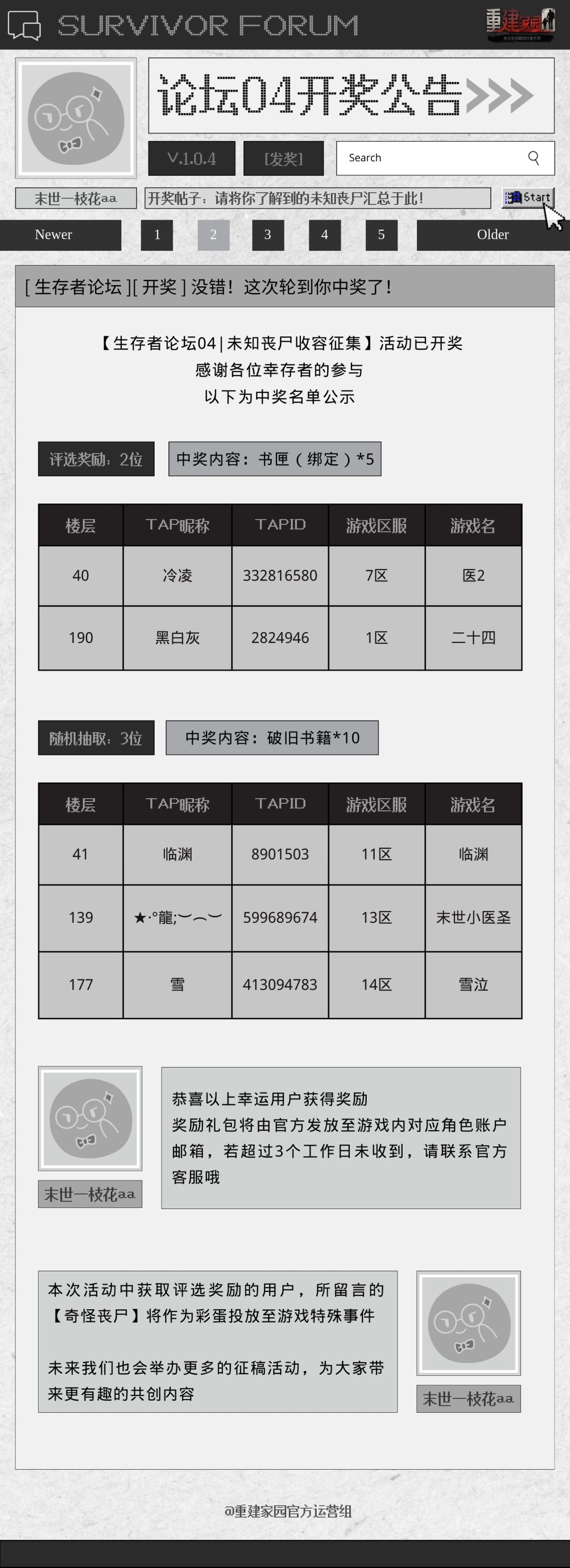 【开奖公告】生存者论坛 04 | 未知丧尸收容征集