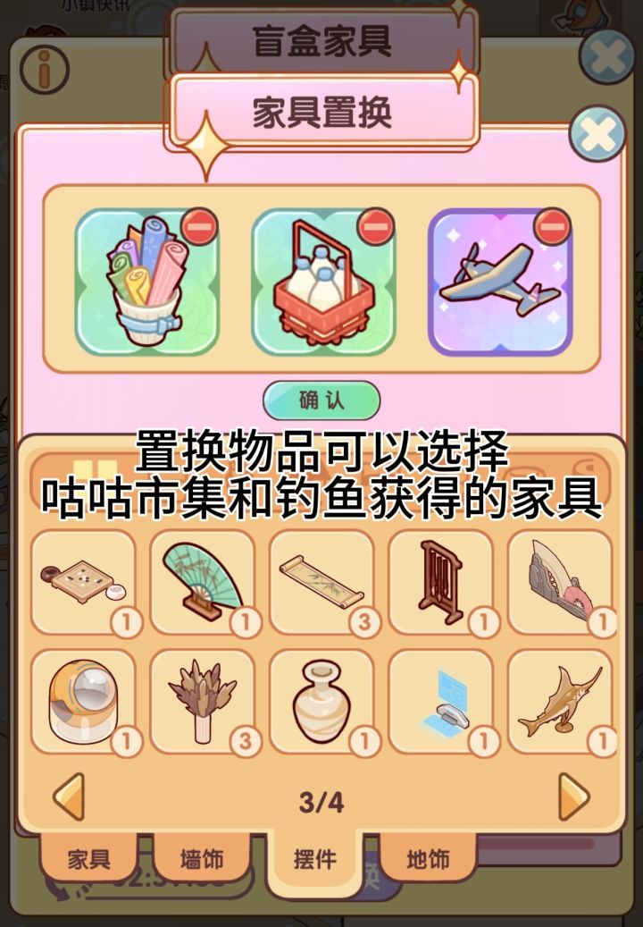 置换物品可以选择咕咕市集和钓鱼获得的家具,不一定要选择自己拥有的限时套间家具,这一点很棒,推荐兑换!
