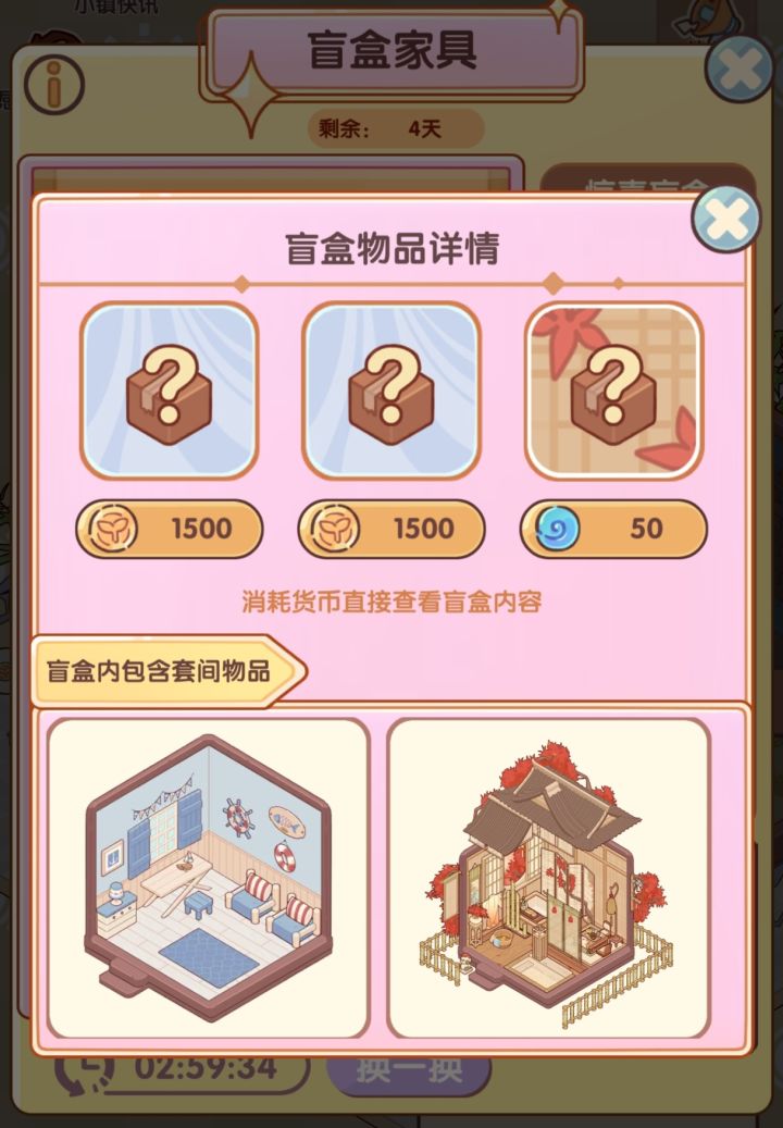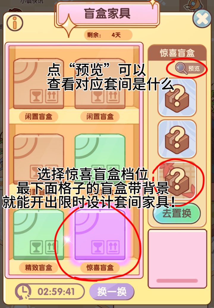 很推荐这次的盲盒家具活动,选择惊喜盲盒档位,有概率获得限时设计套间家具,只要刷新出带背景的盲盒就ok!