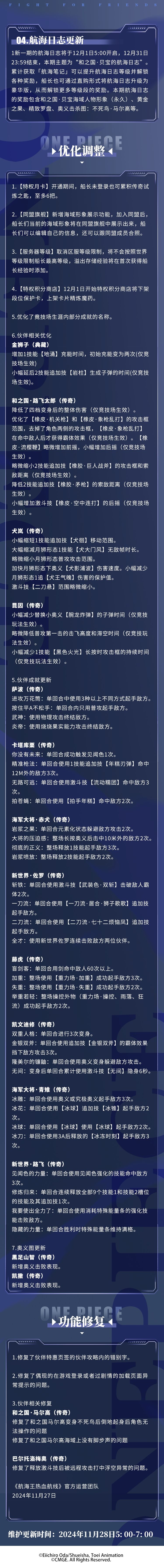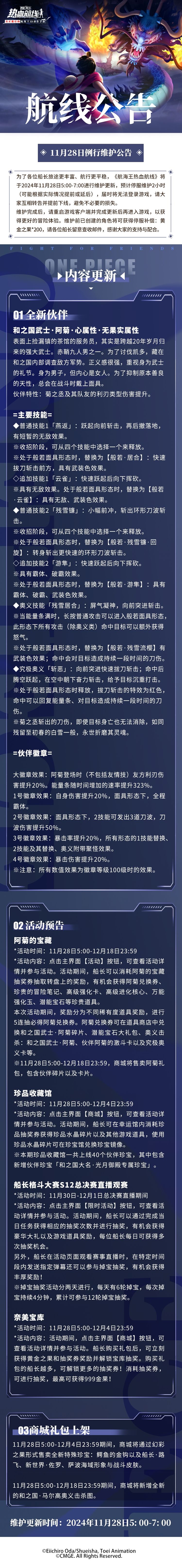 为了各位船长旅途更丰富、航行更平稳,《航海王热血航线》将于2024年11月28日5:00-7:00进行维护更新,预计停服维护2小时(可能根据实际情况提前或延后),届时将无法登录游戏,请大家互相转告并提前下线,避免不必要的损失。