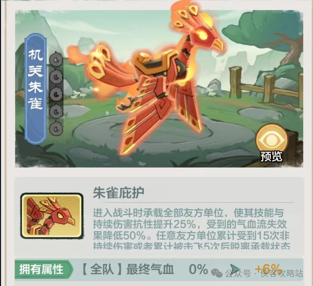 朱雀庇护可以提高队伍的持续伤害抗性,强化剑队的生存能力以及续航能力,配合阵容的击飞效果可以减少神兵的CD时间;