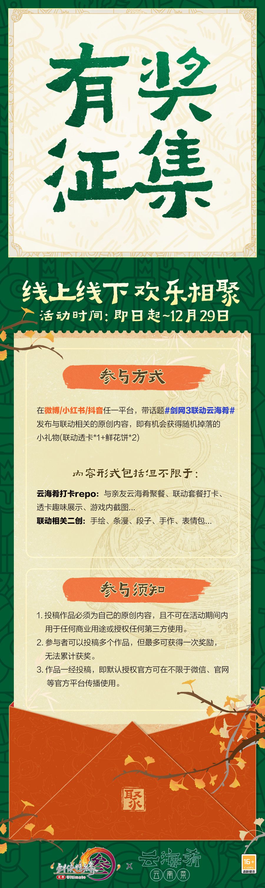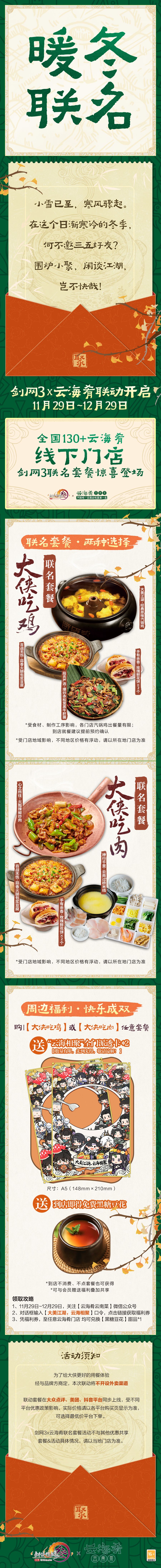 为了带给侠士们更好的用餐体验,经与品牌方商定,本次联动将不开设外卖渠道,联名套餐在大众点评、美团、抖音三大平台同步上线,点单前可选择最低价平台购买。无法前往线下门店的侠士们也可以打开游戏前往主城,云海肴招牌即将亮起,欢迎打卡!屏幕内外,皆可尽享冬日欢娱。或是在游戏中前往主城云海肴招牌前,或是在云海肴门店中品味云南特色,记录下和亲友共度时光的精彩瞬间,珍馐无界,云海可掬!使用移动端AR相机功能,更可以角色跃然于镜头之前,共赴一场光影之约!参与各平台分享活动,特别小礼物随机掉落,等你来拿!