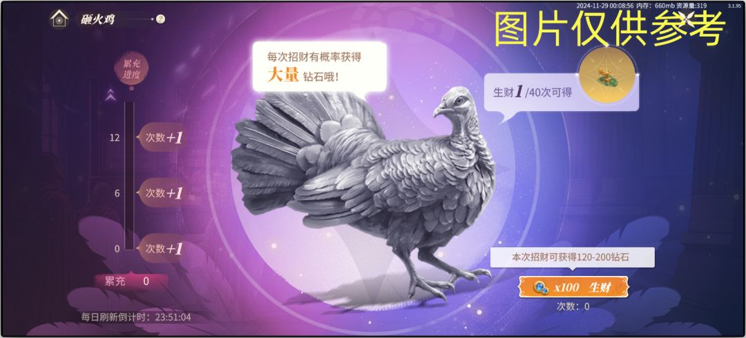 - 累充达到指定金额时,可消耗1次钻石砸火鸡生财,生财后可获得更多钻石!