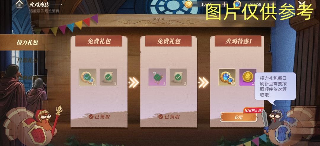 - 接力礼包:每日重置。依次分为免费礼包、火鸡特惠礼包、领取完上一个礼包奖励,才能开放下一个礼包的领取