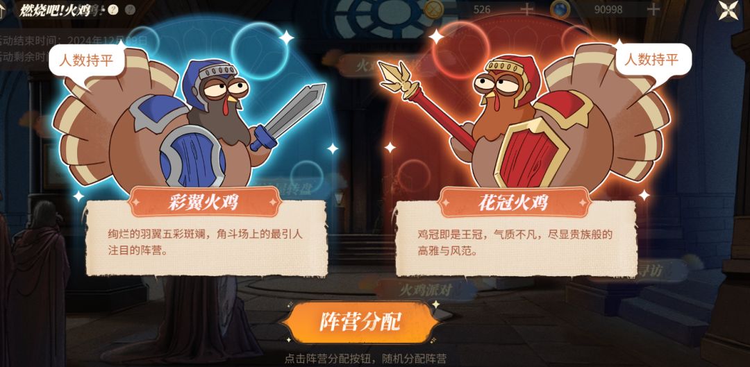 - 每天自动分配阵营,分为彩翼火鸡(蓝方)、花冠火鸡(红方)。阵营每天刷新