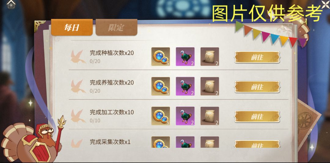 完成每日任务和限定任务,即可领取钻石、火鸡幼崽、火鸡抽奖券等奖励啦