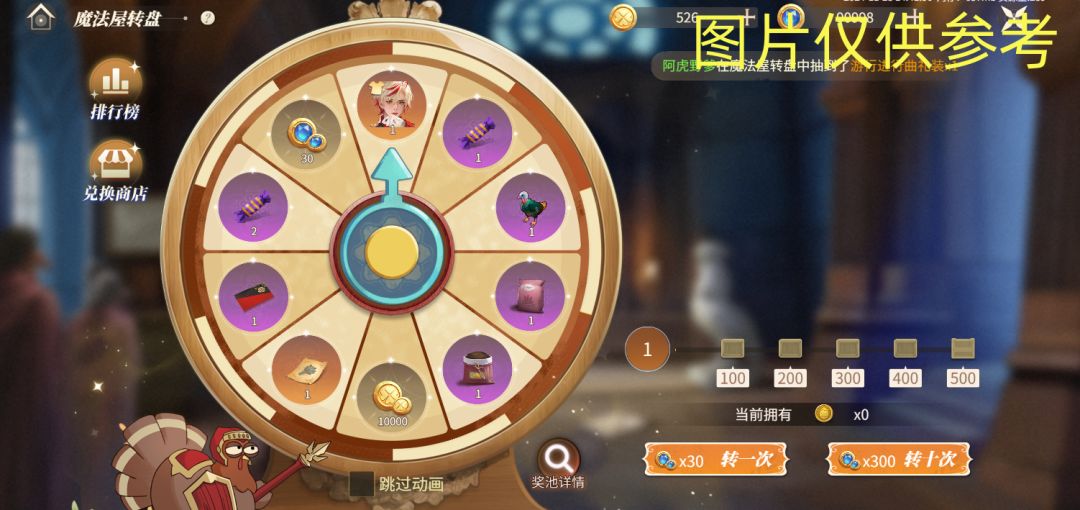 - 消耗火鸡抽奖券(抽奖券不足时消耗钻石),即可进行转盘抽奖。可选择转1次和转10次