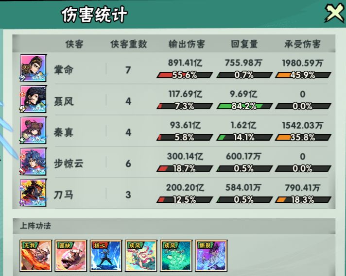 三种战斗模式中,双疾风最适合推图,最不适合pk(可以不上疾风),boss战方面尚可(完美情况下先出无我1、核心、圆缺,后出双疾风;带来的收益比先出双疾风更高。但往往在出气核心的时候却出了疾风1或2也选,毕竟刷新次数有限。)