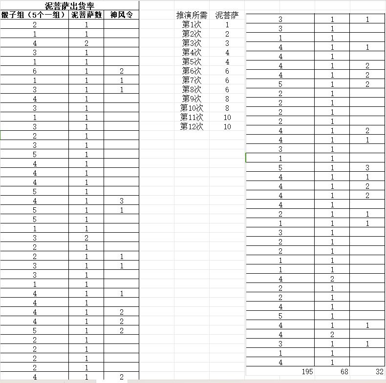 在下试了68个泥菩萨,共用骰子195组共975个,平均不到15个骰子出一个泥菩萨;额外出令32个