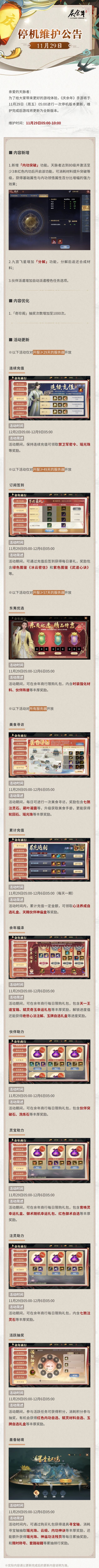 为了给大家带来更好的游戏体验,《庆余年》手游将于11月29日(周五)05:00进行一次停机版本更新,维护完成后游戏将更新为全新版本。
