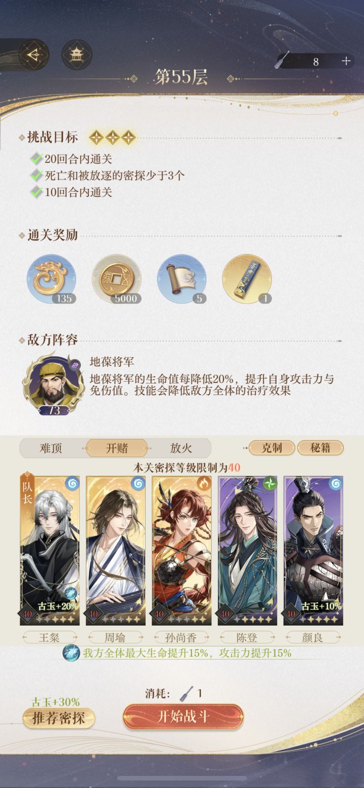 ✨阵容:粲哥香登良,生存输出位均可换,用学长会好打很多;拐试过带贾诩or庞统血量站不住