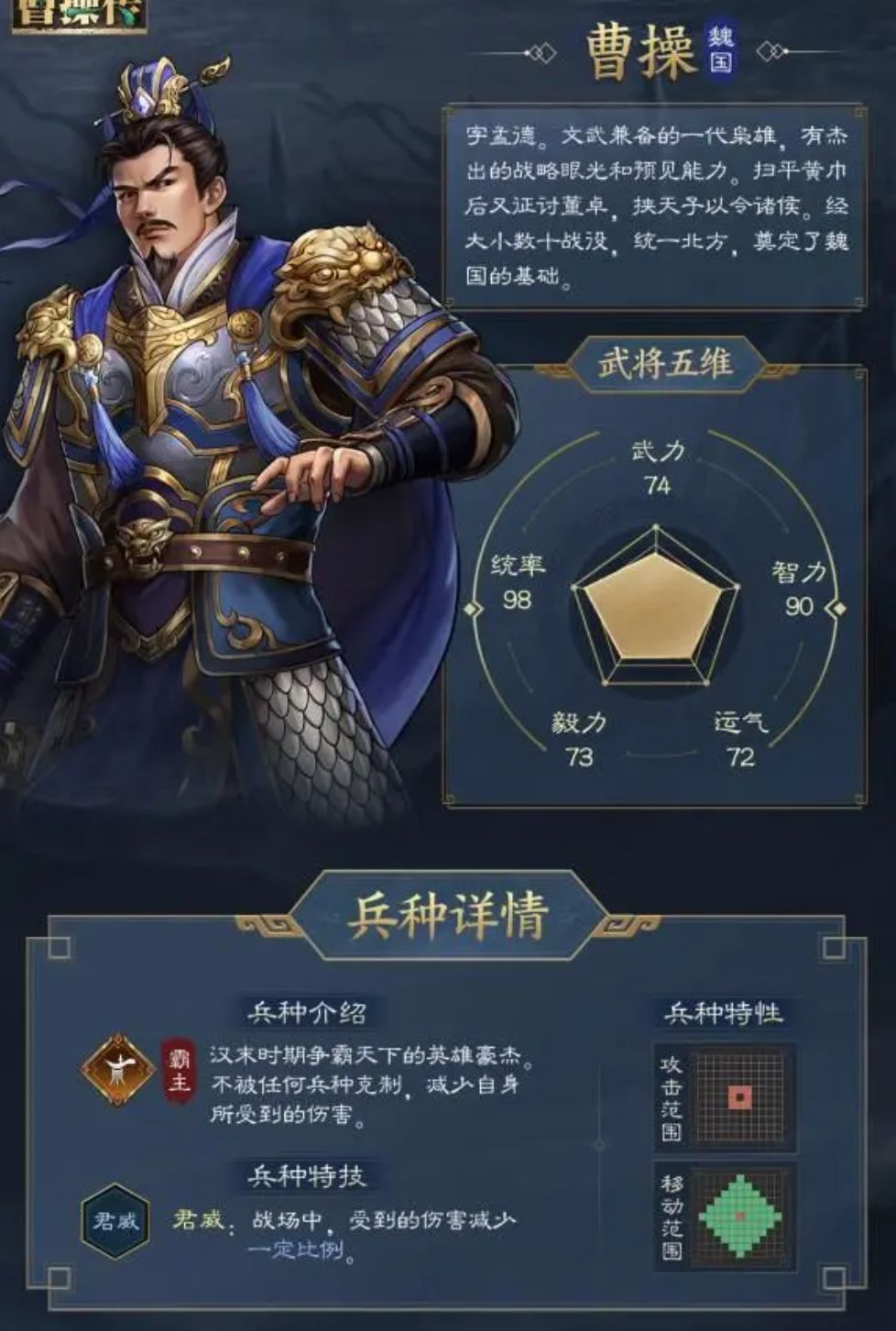 - 更强调角色技能间的搭配,这点其实在很多同类型游戏中也有体现,说白了就是类似于体系的设定,而新版本曹操传在上阵具有相关联系技能的数位武将时,便能打出1+1>2的体系效果,例如之前在官方公布的曹操资料中就写到了曹操适合搭配典韦、夏侯惇、荀彧等角色,因为他们在技能方面就能产生一定的连携反应......