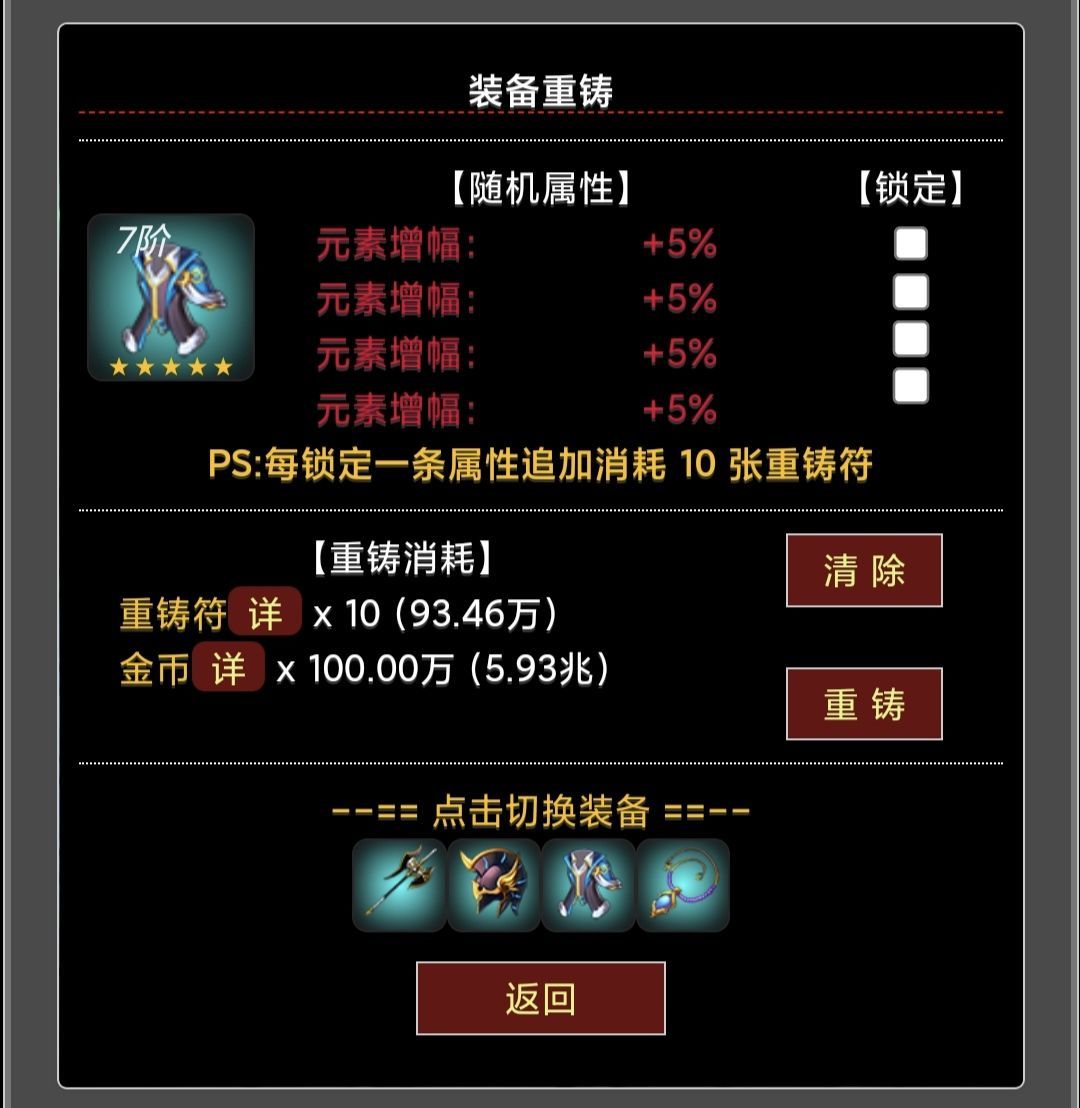 -【打造-精炼】 ①精炼石主加特殊属性【连击50%-中毒50%-速度50%】这三种必须点满,剩下的【减防30%-50%】视情况而定。 【⭐核心】 ②在精炼石缺少的情况下,先把上面属性的点满,在考虑攻击的百分比。可以四件套基础属性都加10%,然后主加攻击百分比。 ③如果满足不了①的条件下,不建议玩此流派。