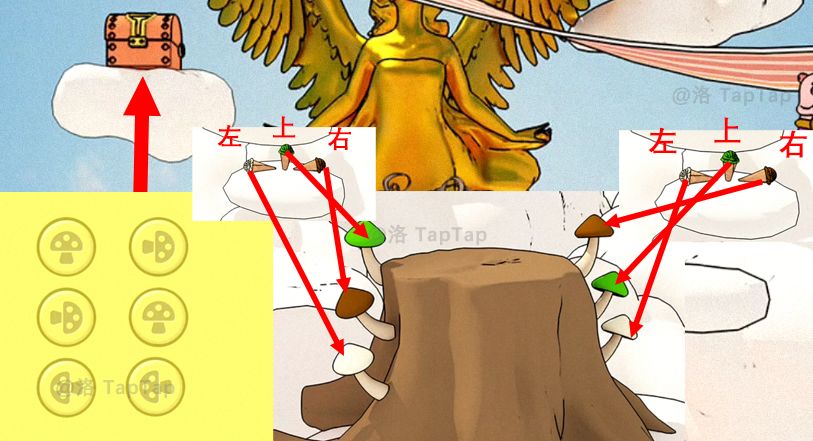 8.点击女神像左边的宝箱,结合【6】中冰淇凌的颜色和朝向,以及【7】中蘑菇的位置和颜色,调整宝箱上机关;获得【金币】