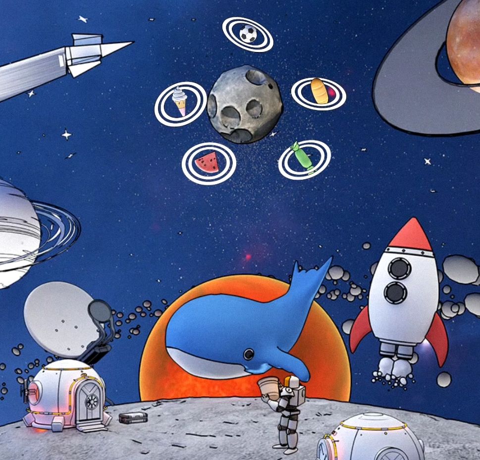 4.宇航员将食物抛向空中,由于行星引力,食物们开始围绕着上方的星球(欸,为什么有颗足球