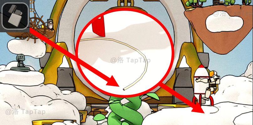 2.点击鲸鱼下方右边的小屋门上的机关,【1】中火箭尾翼等同于机关上的三角形,尾翼数对应的窗户数是需要填入的数值;打开小屋门,获得【梯子】