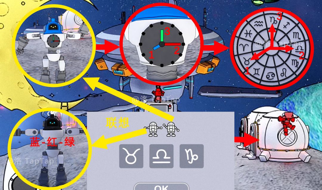 8.点击读书的宇航员下方的小屋,根据【6】中得到的顺序【蓝-红-绿】为【7】中的三个指针排序,结合星座罗盘图(获取方式详见【外星球篇-任务二-步骤1】),可以确定三个星座;将其输入门上机关,获得【飞船壁板】