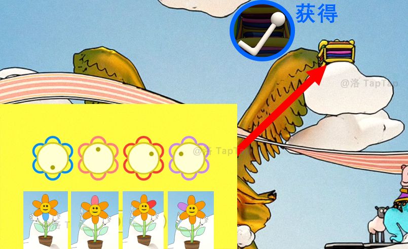 4.点击树墩上方的花盆,记录下其每一次旋转后的花瓣颜色和位置