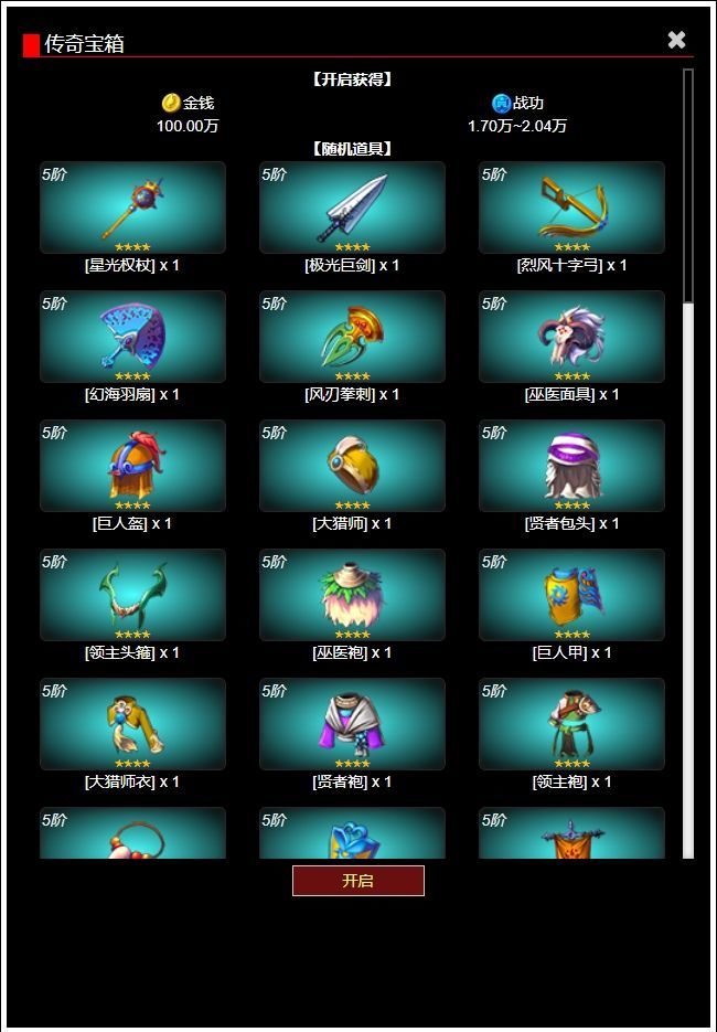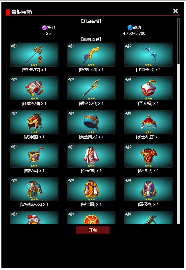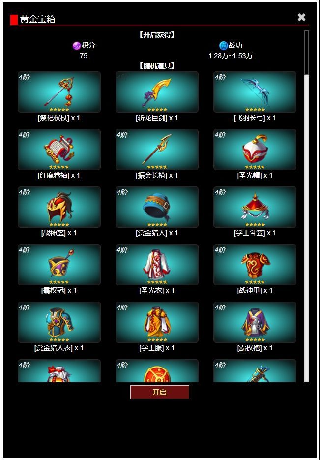 宝箱必出3份奖励,1份资源、1份战功、1份装备或者卡片宝箱奖励的内容根据宝箱获得时的联赛等级与宝箱等级不同而不同,联赛是中后期获取资源与装备的重要玩法之一。