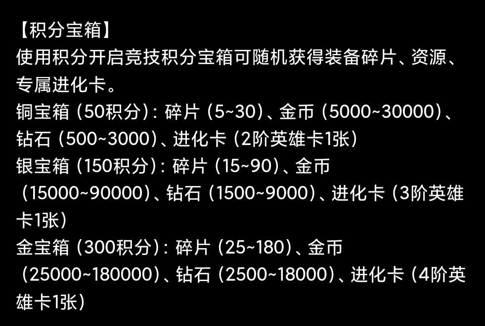 宝箱-铜宝箱- 开启条件:50点竞技积分- 获取奖励:研磨材料(5-30)- 钻石:(500-3000)- 金币:(5000-30000)- 卡片:2阶英雄卡片^1(8张专属竞技·铜宝箱专属卡片)