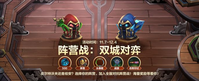 皮尔特沃夫还是祖安?请做出你的选择!截止至12月4日23:59,选择你的阵营并加入全服对抗阵营战,帮助所在阵营取得最终胜利,就有魄罗能量*500、局内表情-做的不错!、击败印记-艺术望远镜、英勇战旗-怒荆战旗和头像框-荣誉阶梯海量奖励等着你~