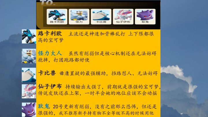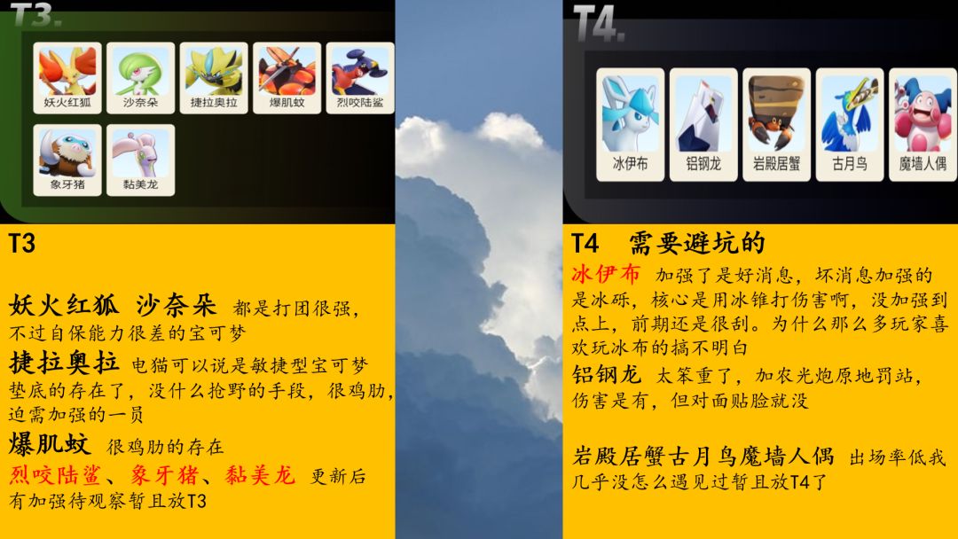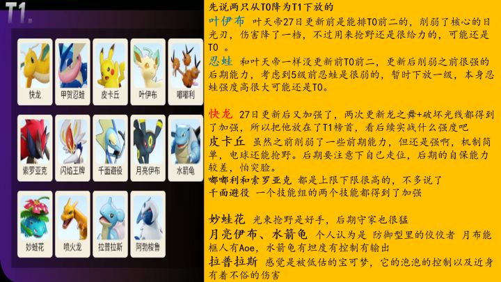 快龙 27日更新后又加强了,两次更新龙之舞+破坏光线都得到了加强,所以把他放在了T1榜首,看后续实战什么强度吧