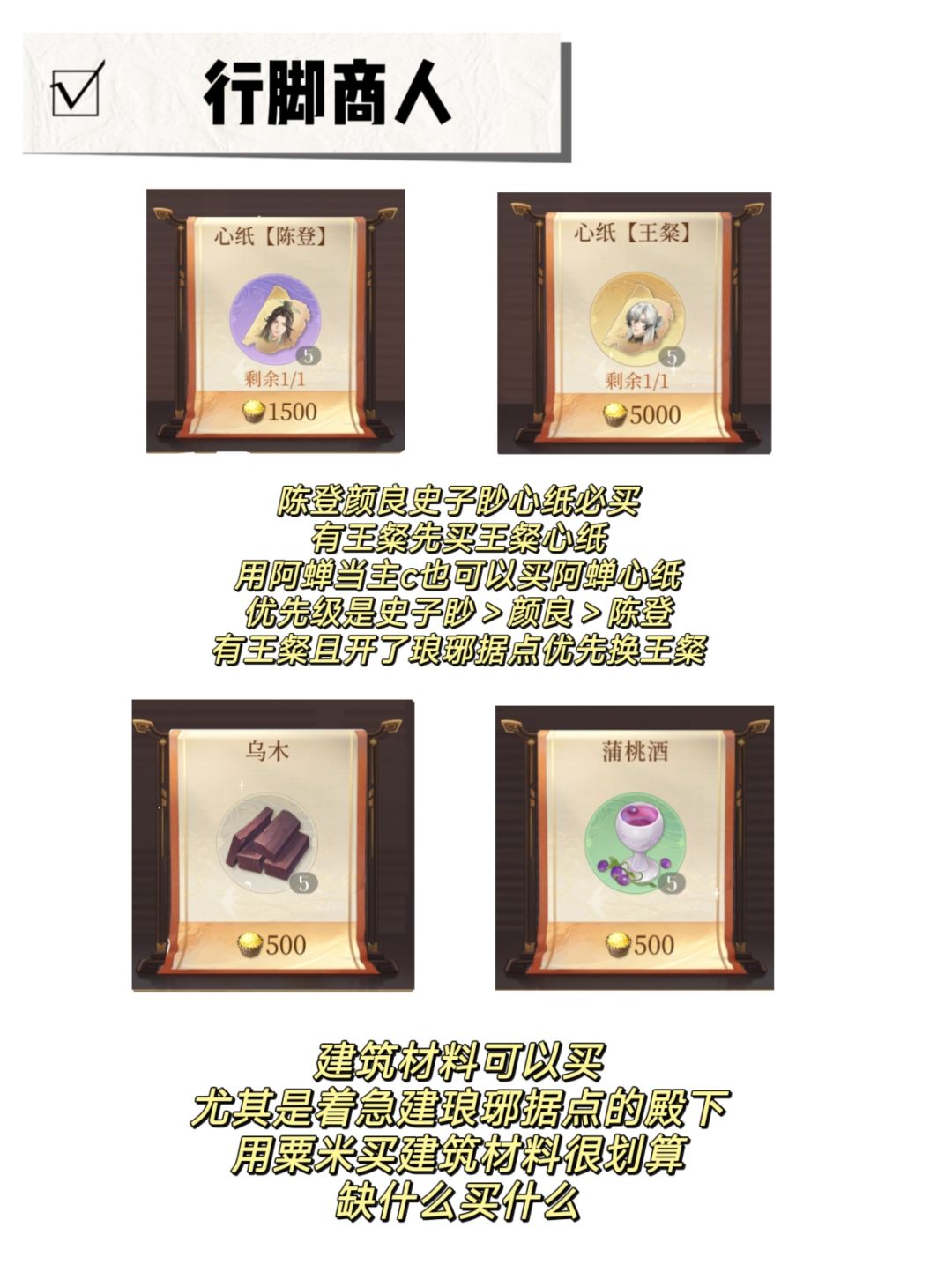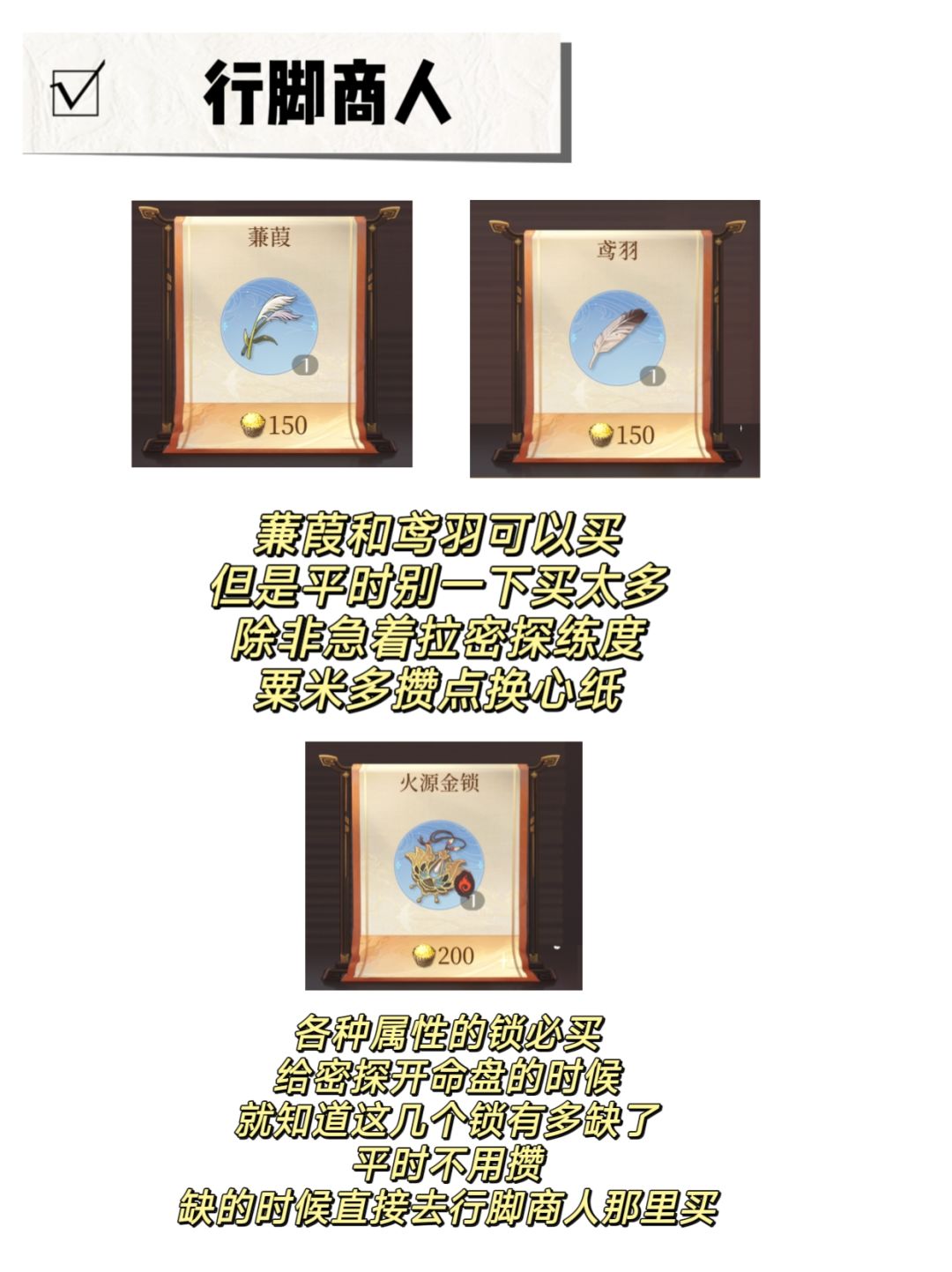 ⭕行脚商人那里每天可以免费刷新一次,没有自己想买的东西可以刷新试试