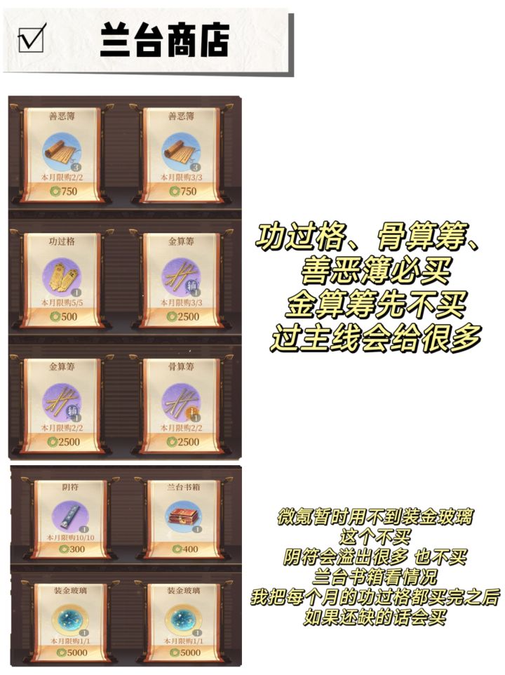 ⭕兰台还有三个限量的符传可以买,这个我忘了放图里。如果不是着急抽卡的话可以先买功过格骨算筹,等鸟抬下一期兰台了再买这三个符传
