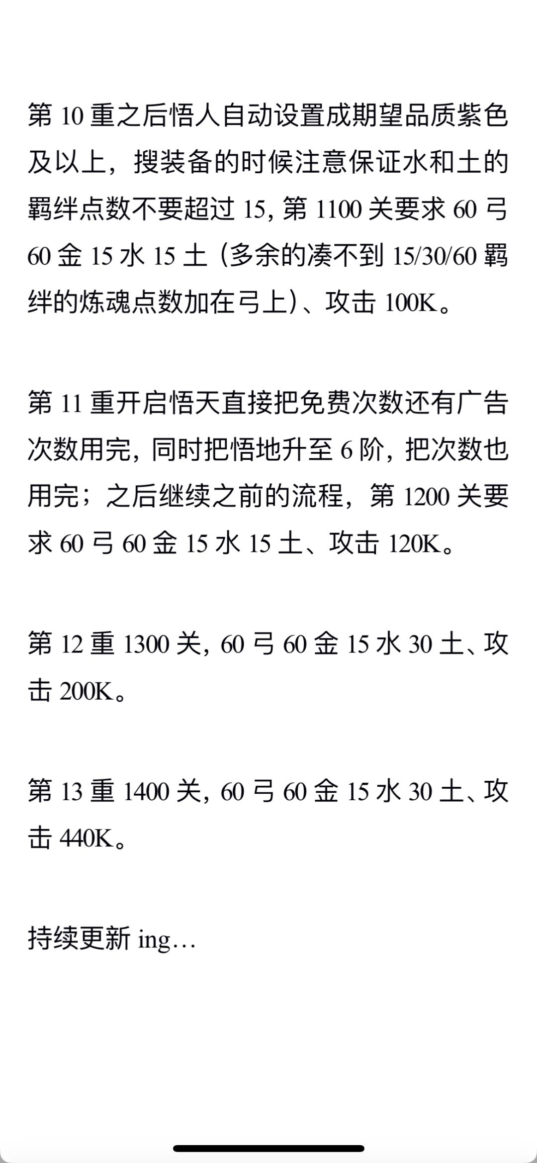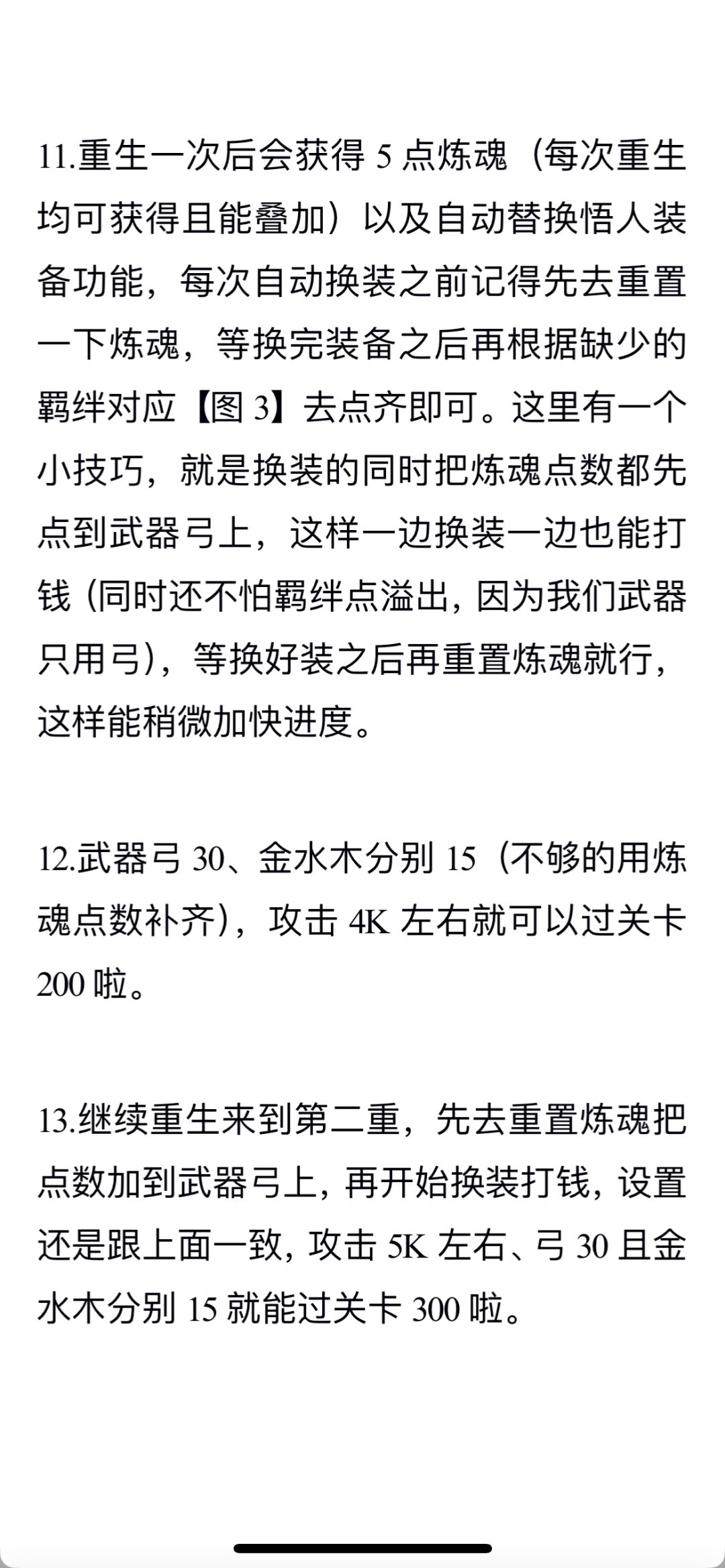 7.一边拿装备一边往上调整可以打得过的关卡,因为越往上关卡每小怪金币更高,等拿到弓30、水金土之中任意一个15之后就能打通第100关啦,攻击大概是3K到4K左右。