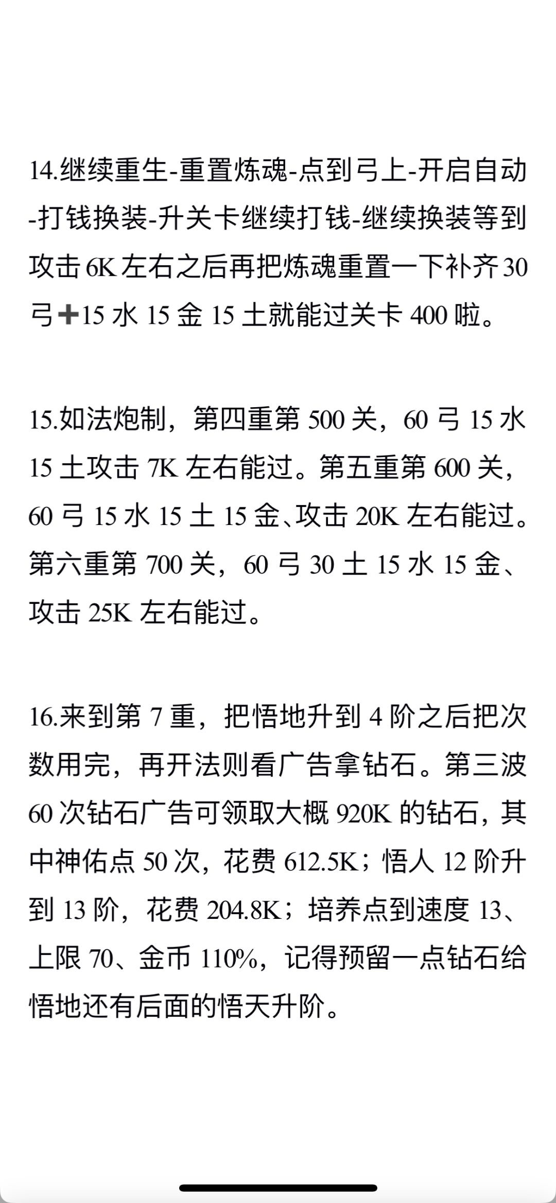 3.钻石用法:原则上来说一半用来点神佑(直接点就行不用等,因为加成是自动递增的),另一半优先点悟人等点不动之后剩下的点培养。第一波60次的钻石广告可获得207K钻石,其中神佑点20次,累计花费95K;悟人点到11阶,累计花费10.23K。