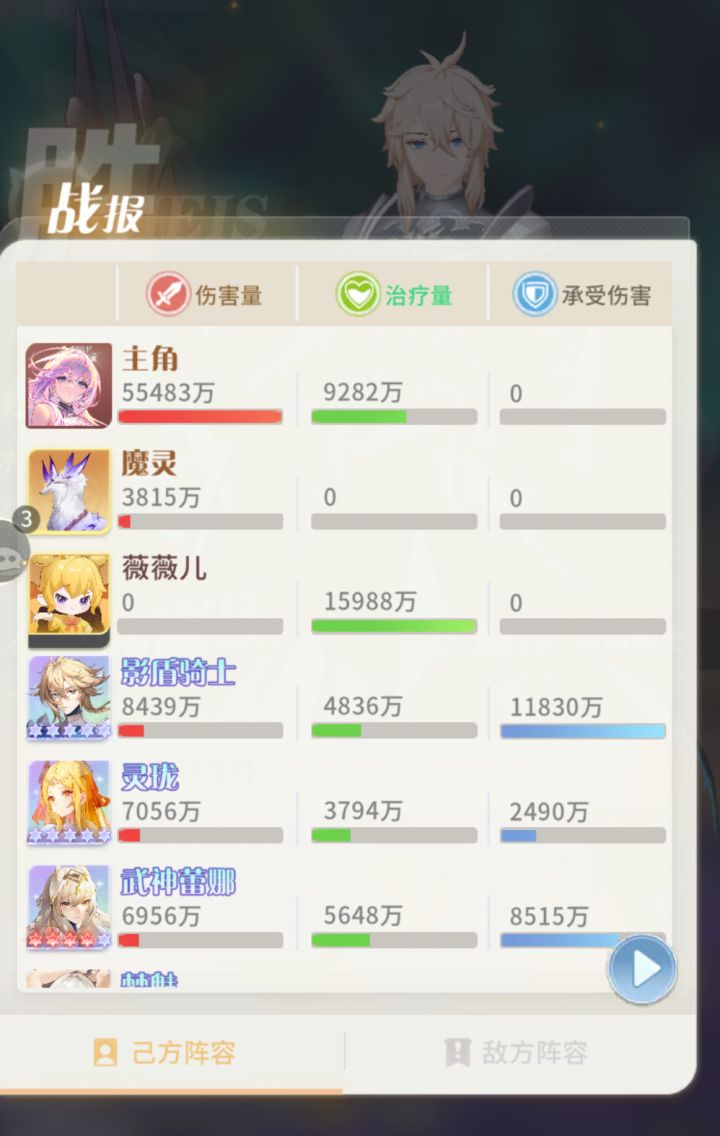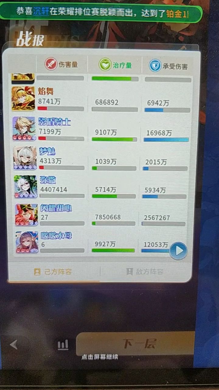 然后介绍一下大后期顶级一队角色,输出只有梦寐,剑心,蕾娜,燃烧要一整队才强,加焰舞更强,蜜雪汉娜生存太差,要给剑心当挂件,弥撒都懂低星可换其他UR5,还有玲珑的加成和控制,影盾骑士大家要千万千万注意!!!没有推荐这个角色的阵容攻略一律视为二流!!!90%普攻分摊完全是神卡级别,还是初始sr!前期带上猎魔者凑羁绊,影盾放在5号保2号主c,轻轻松松越两倍战力刷图,越10%战力pk,后期单上放2号位保13位双c,这才是永久c位!除了全燃烧队都要带影遁!还有黑鸦可以UR5换下低星弥撒配合影遁保留梦寐羁绊。其他如女王双子,都是大后期废卡,蜜雪也废,主要是太脆,只能待在巨氪古域队。