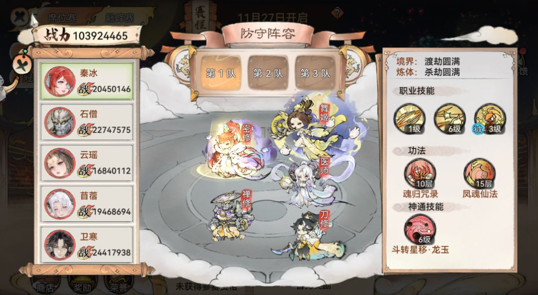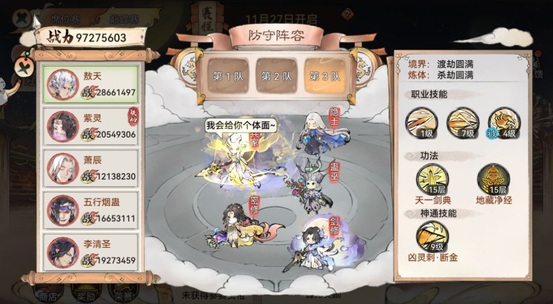 第一种是人手不足的情况,毕竟要拉出16个有练度的弟子对于大部分玩家来说还是很困难的,这类玩家也谈不上阵容,基本就是按战力分成上中下三队。前两轮中下互送,第三轮上队决胜负。现在的赛制让田忌赛马的偷鸡行为不那么容易出现。