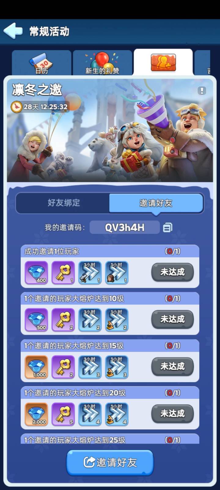 游戏主界面右上角-常规活动-凛冬之邀-输入好友邀请码:QV3h4H 领钻石,金钥匙,建筑加速。