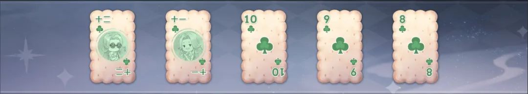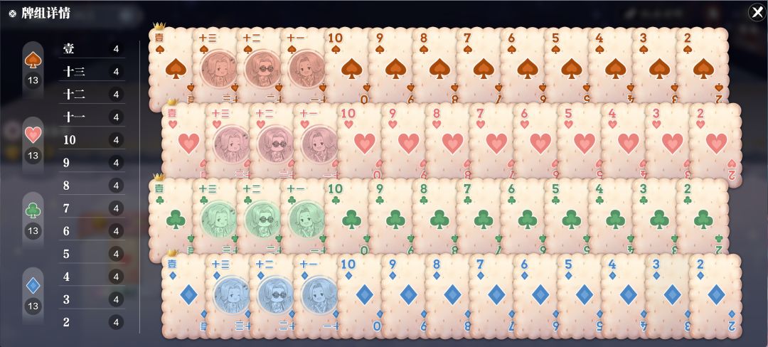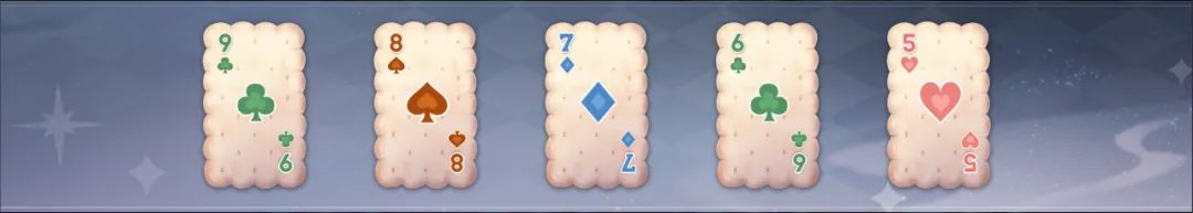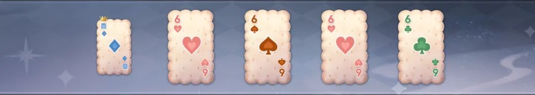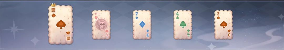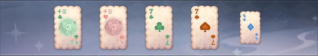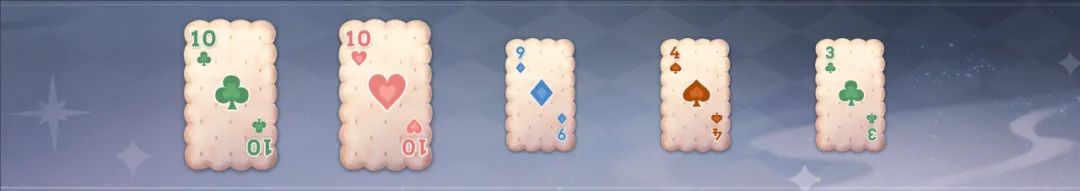 每一局开始时,均拥有红桃、方片、黑桃、梅花四种花色各13张点数为1至13的饼干牌。每回合开始时均会将牌组重置为未抽取状态,之后抽取一定量的饼干牌补满手牌数量,出牌和弃牌之后,同样会从剩余饼干牌中抽取补满手牌。
