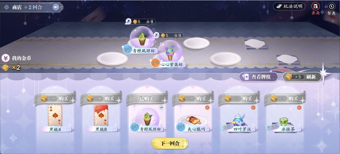 每回合通关后均会开启,开启后可消耗金币购买饼干牌、甜品、饮料,这三种道具各会刷新2个。也可消耗金币手动重新刷新全部商品,刷新消耗逐步增加,且每次开启商店均有刷新次数上限,下一次开启商店时将重置刷新消耗。