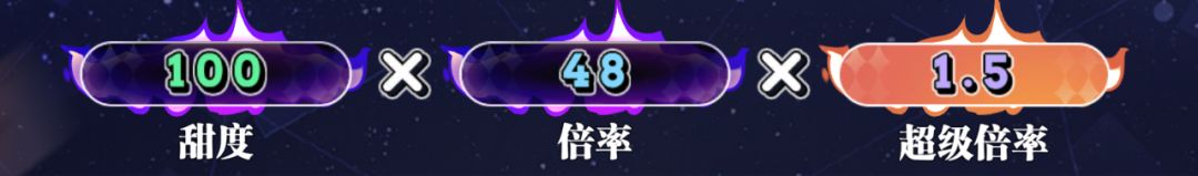 仅可通过甜品、泡泡、果酱等效果获得,初始值固定为1,与甜度和倍率不同的是,每一条超级倍率加成之间,均为累乘计算,所以超级倍率加成之间不存在任何稀释。