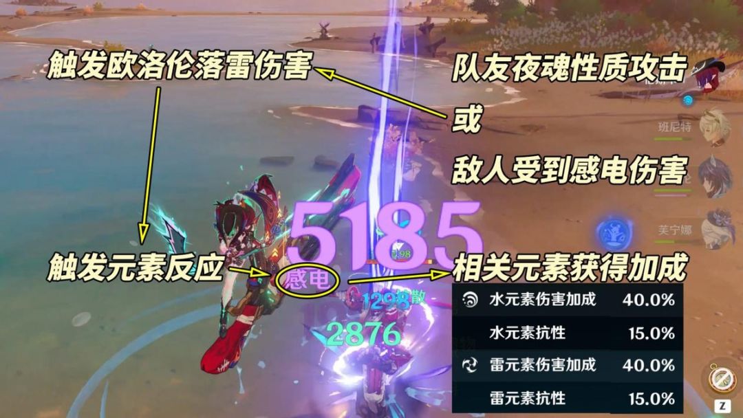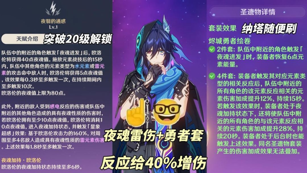 【感电/纳塔队】当敌人受到感电伤害或队友触发夜魂性质伤害时,欧洛伦会消耗10点夜魂值进入夜魂加持状态,并造成1次160%倍率夜魂性质的雷元素伤害。此伤害若造成雷元素相关反应,将激活圣遗物烬城勇者绘卷效果,使得全队获得反应相关元素40%伤害加成。