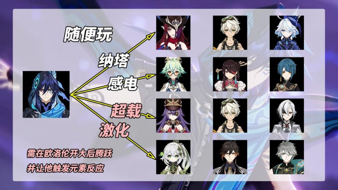 ※属性推荐,攻击沙、雷伤杯、暴击头,副词条‘暴击、暴伤、攻击、充能’。欧洛伦60点元素爆发耗能,在天赋、圣遗物、命座多方面加持下,能量需求不高。0命120%充能,4命及以上则不需要考虑充能。【队伍搭配】欧洛伦无法为风、岩、物伤提供伤害增幅,排除这3种情况,其余队伍只要欧洛伦入队不影响元素反应都可考虑。例如以下几种:纳塔队,恰斯卡+欧洛伦+芙宁娜+班尼特。感电队,砂糖+欧洛伦+行秋+北斗。超载队,仆人+夏沃蕾+班尼特+欧洛伦。注意,需在敌人处于火底的时刻欧洛伦放大+起跳!否则只能触发12%增伤,吃不满40%增伤。激化队,艾尔海森+纳西妲+欧洛伦+钟离。只要敌方处于激化状态,欧洛伦丢大招后起跳即可,为海纳稳定提升40%草伤。