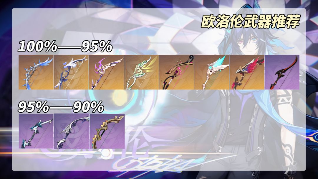 在前文‘速玩版’的基础上,新增更细节的养成建议,适合有一定资源溢出或欧洛伦真爱玩家考虑。【天赋】元素爆发>元素战技>>普通攻击【武器推荐】冬极白星(假设为100%)>若水>飞雷之弦振>猎人之径>最初的大魔术>天空之翼>星鹫赤羽>黑岩战弓>95%>暗巷猎手>静谧之曲>碎链>90%。