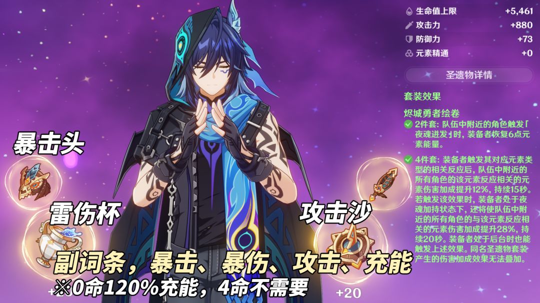 ※纳塔锻造武器精5碎链,与目前最优武器精1冬极白星,差距不到10%,配置上的差距不算高。【圣遗物推荐】首选‘烬城勇者绘卷’,当队伍中已存在该圣遗物则可考虑2雷2攻搭配。不过目前纳塔辅助/副C较少,会有冲突的一般也就希诺宁,而她普遍短暂的夜魂输出时间触发元素种类不多,不如让欧洛伦带相同圣遗物,继续补充其余元素增伤~