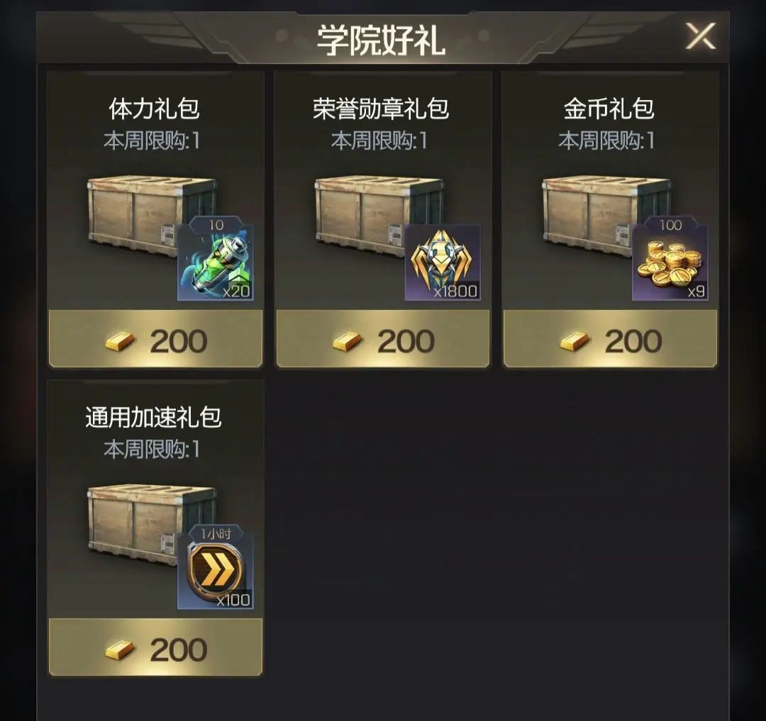 以小编当前学院等级推送的学院好礼为例,分别是体力、荣耀勋章、金币和通用加速礼包: