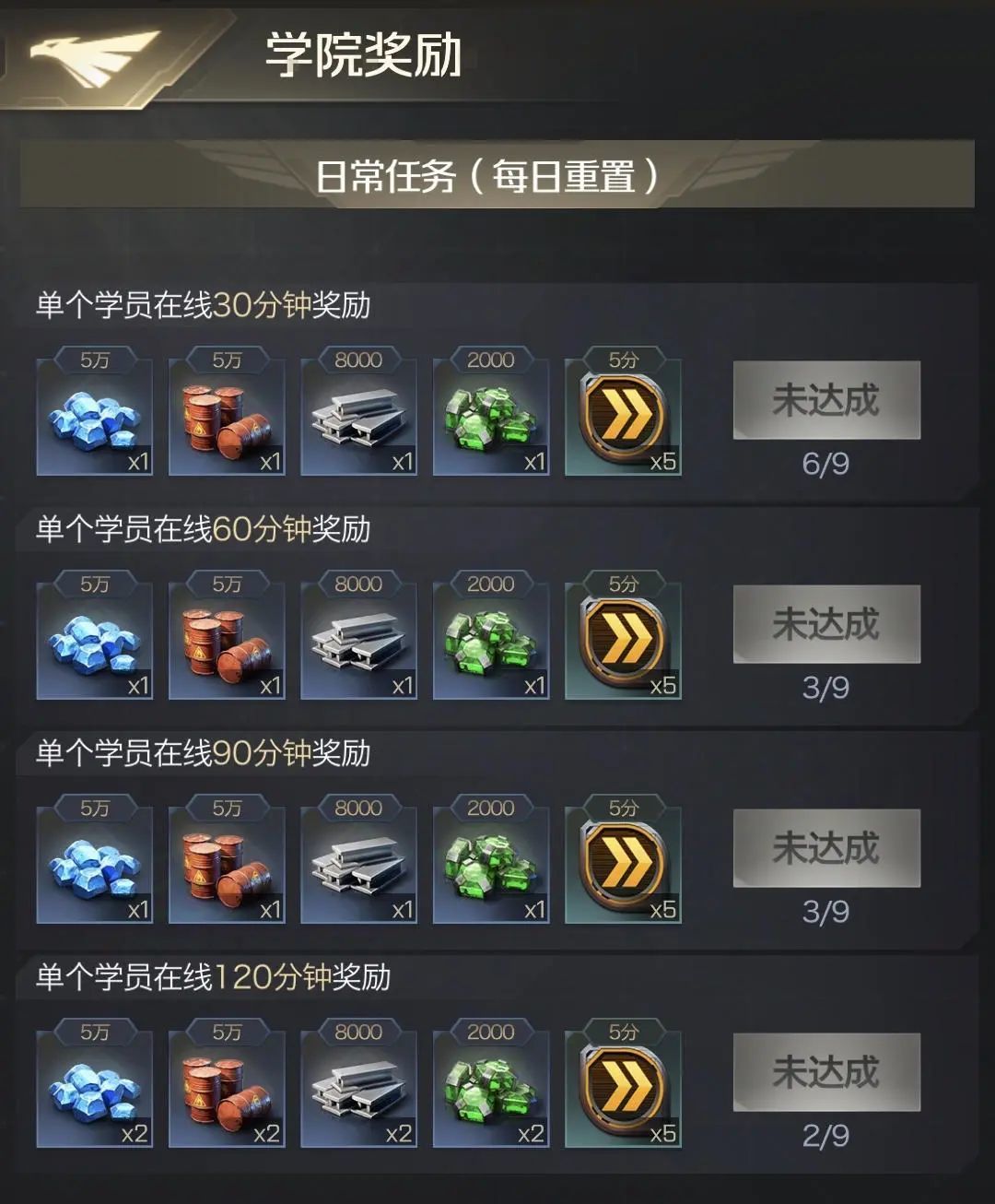 学院成员可通过完成学院任务获得等同于学院积分数量的学院经验,任务包括学院当日累计上线人数、当日消耗体力、当日领取在线奖励次数等。