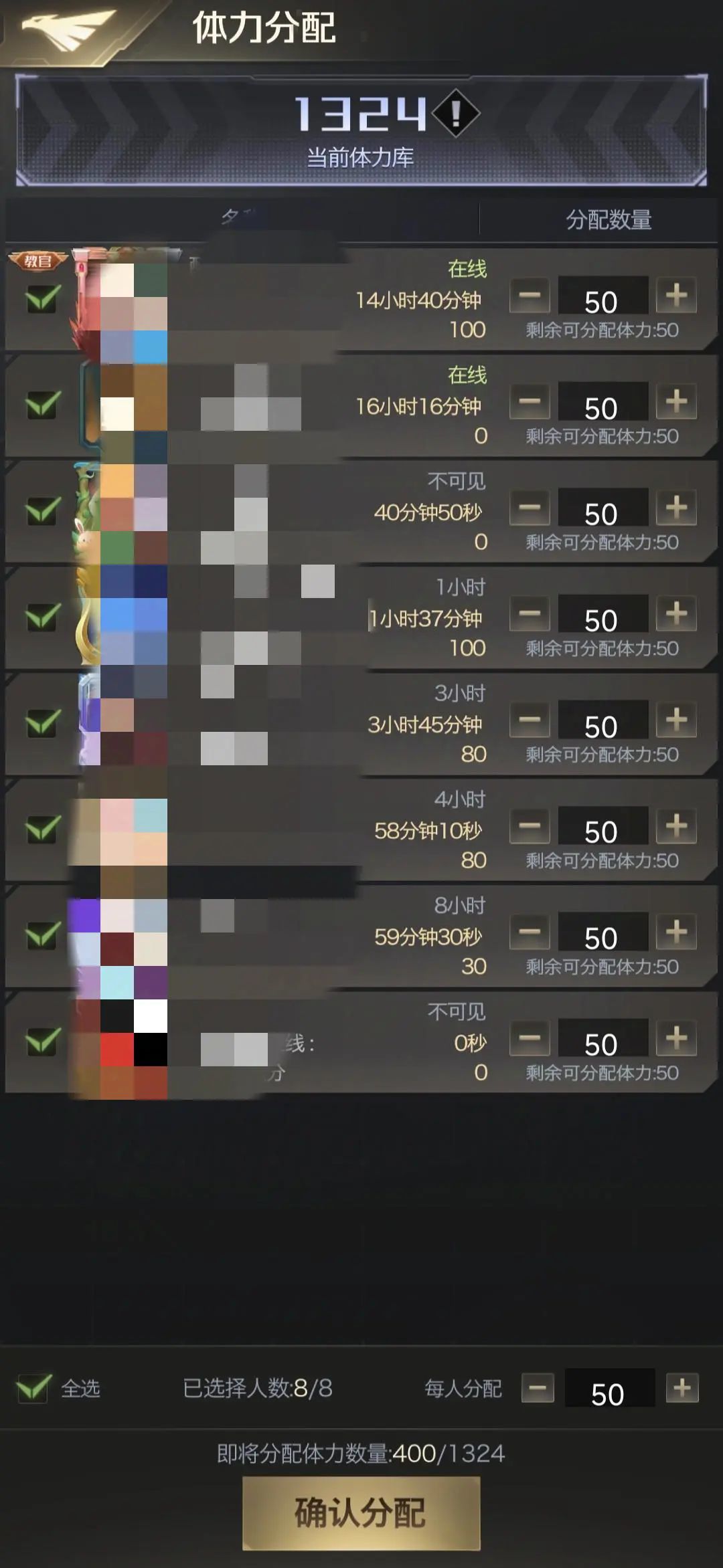 教官可以为学院中的成员分配已经获取的学院体力,学院成员消耗体力会以5%比例返还到学院体力中,批量分配前要先选中想要分配的成员,如果先进行每人分配操作,然后选中想要分配的成员会导致分配的体力无法及时同步到需要分配的成员身上。