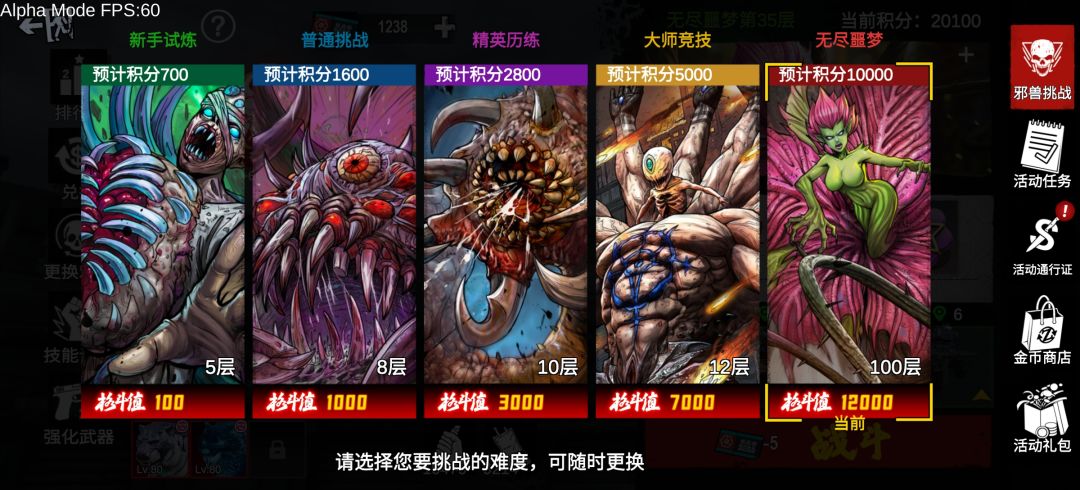 2、一共分为5个难度,其中最高无尽噩梦难度需要先在大师难度中获得4000积分以上才能解锁。不同积分影响排行和奖励兑换的开启。每轮挑战都有5次外部复活机会,强退不扣次数但损失门票。此设定与狩猎玩法相同。