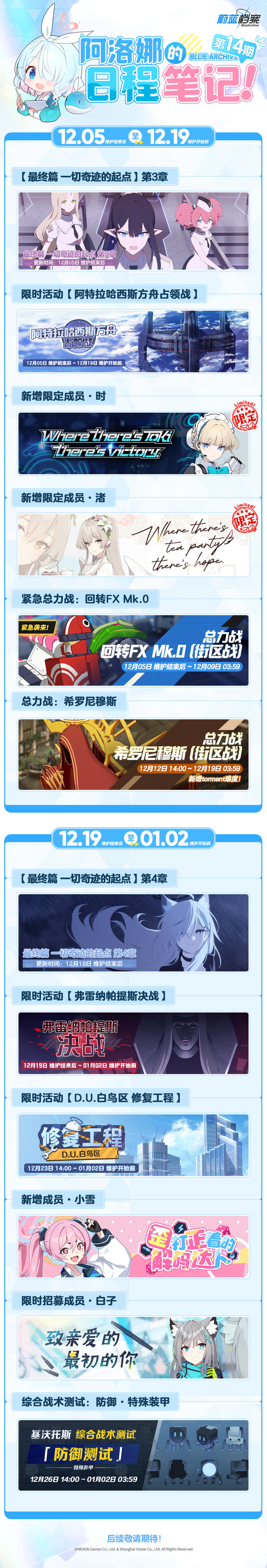 日程笔记仅供老师参考未来版本更新后活动内容及招募时间等内容,具体活动规则还请老师关注后续官方社媒及游戏内、官网的公告。下方附带了当期版本日程笔记长图,其中包含了期间的活动开放时间安排以及多倍活动的开启日程,以供老师参考~