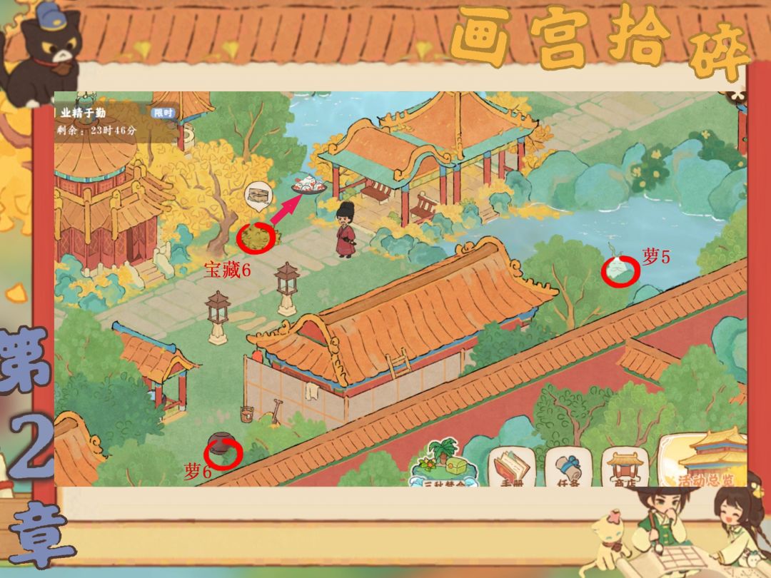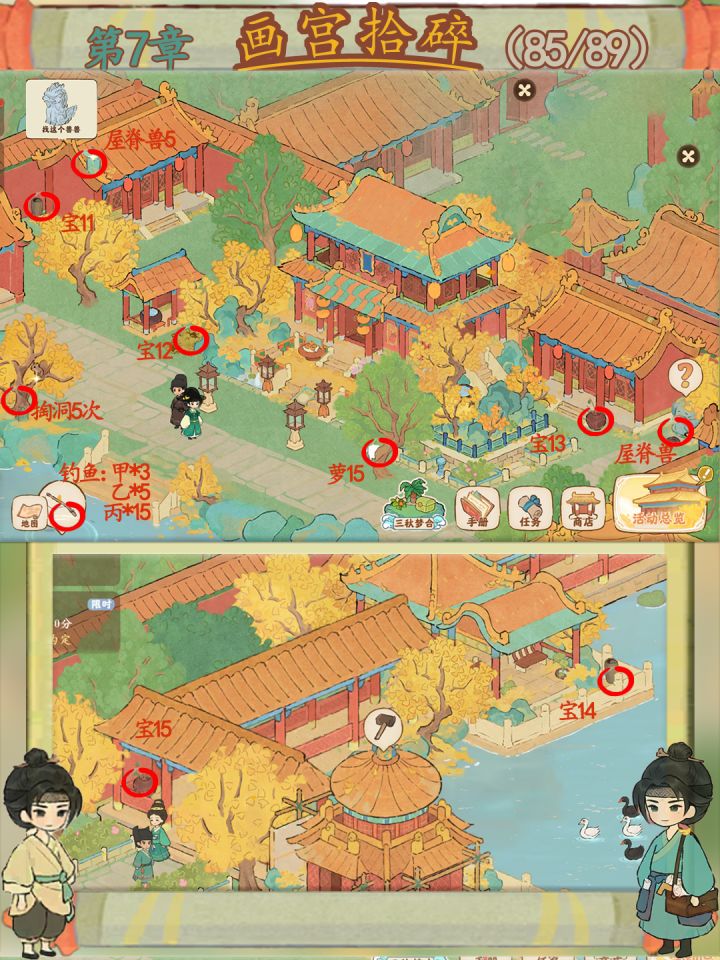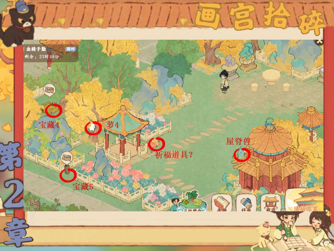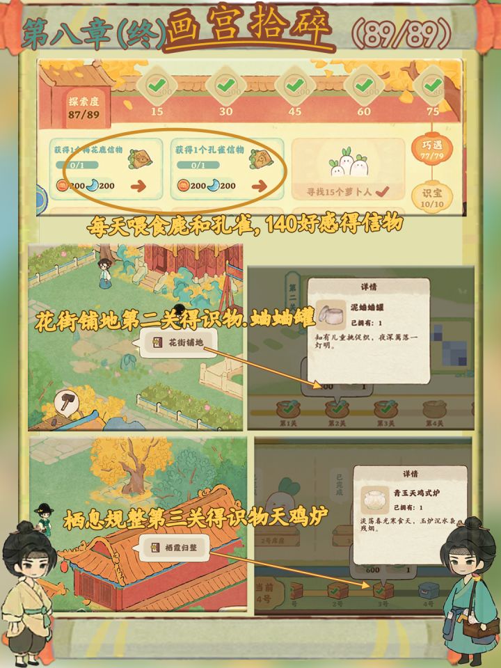 画宫拾碎今天已经进入收尾阶段啦,宝宝们记得关注一下还有什么没完成哦,梅花鹿和孔雀记得要去喂。还有第一章放不下放评论区了