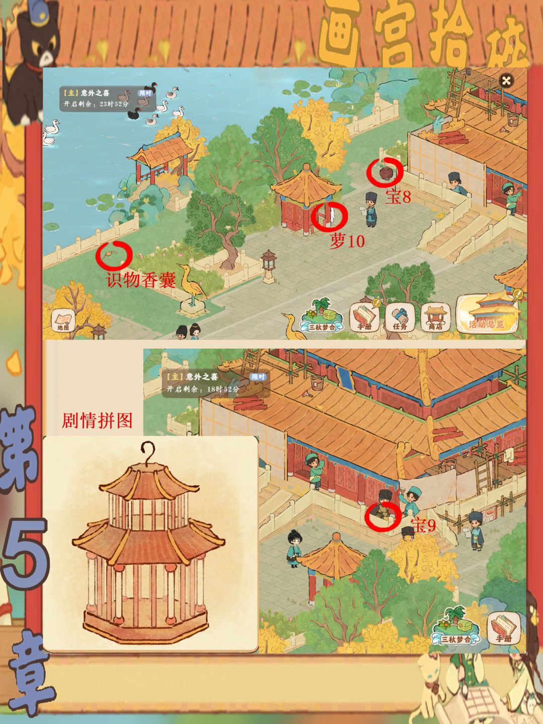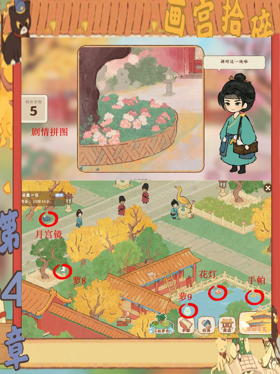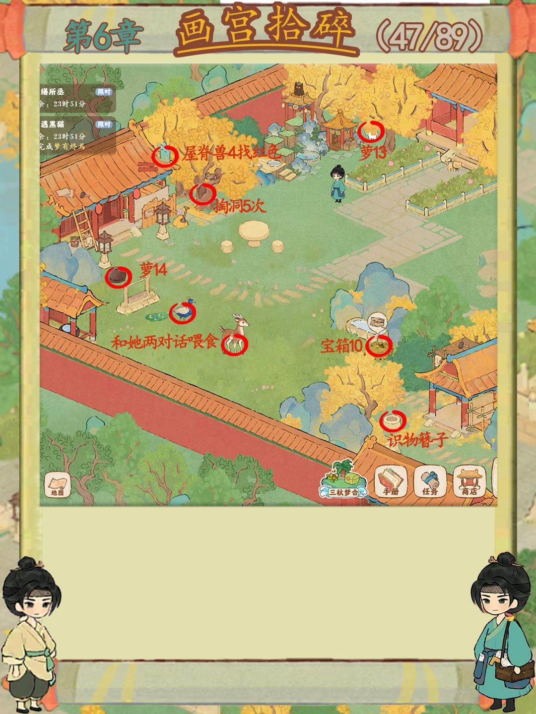 画宫拾碎今天已经进入收尾阶段啦,宝宝们记得关注一下还有什么没完成哦,梅花鹿和孔雀记得要去喂。还有第一章放不下放评论区了