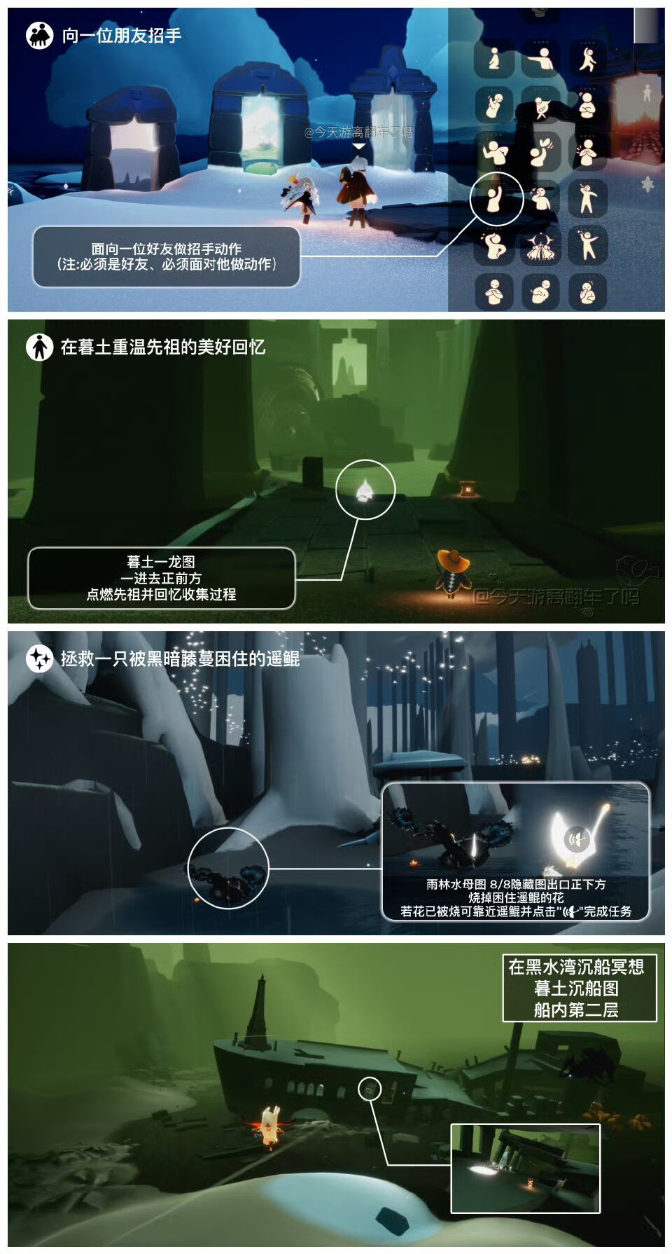 《光遇》游戏中每天的每日任务及大蜡烛的位置都不相同,玩家完成每日任务及收集大蜡烛都可以得到丰厚的兑换奖励,奖励可以用于兑换各种动作及道具,不过很多小伙伴不知道每日任务怎么做,又懒得自己去找大蜡烛的位置,我们汇总了每日任务的完成攻略以及蜡烛位置,一起来看看吧!