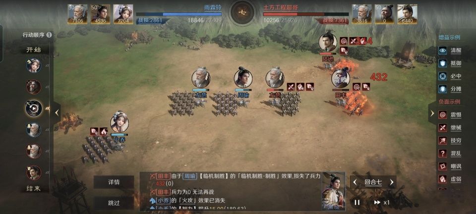 小乔战法:天香+屈人之兵+经天纬地。韬略库:公瑾信(专属)+机动善本+合谋善本。重骑兵特性坚韧,专精点亮骁勇善战。这场战斗的排兵布阵情况,是左慈在前排,周瑜和小乔两口子在后排。因为这个人员构成,我才给起了左小瑜这个听上去十分清秀的名字。左慈除了做肉盾,还额外吹起了大风,因为同等级状态下,左慈的先攻值高于周瑜,所以风暴会增益焚营。